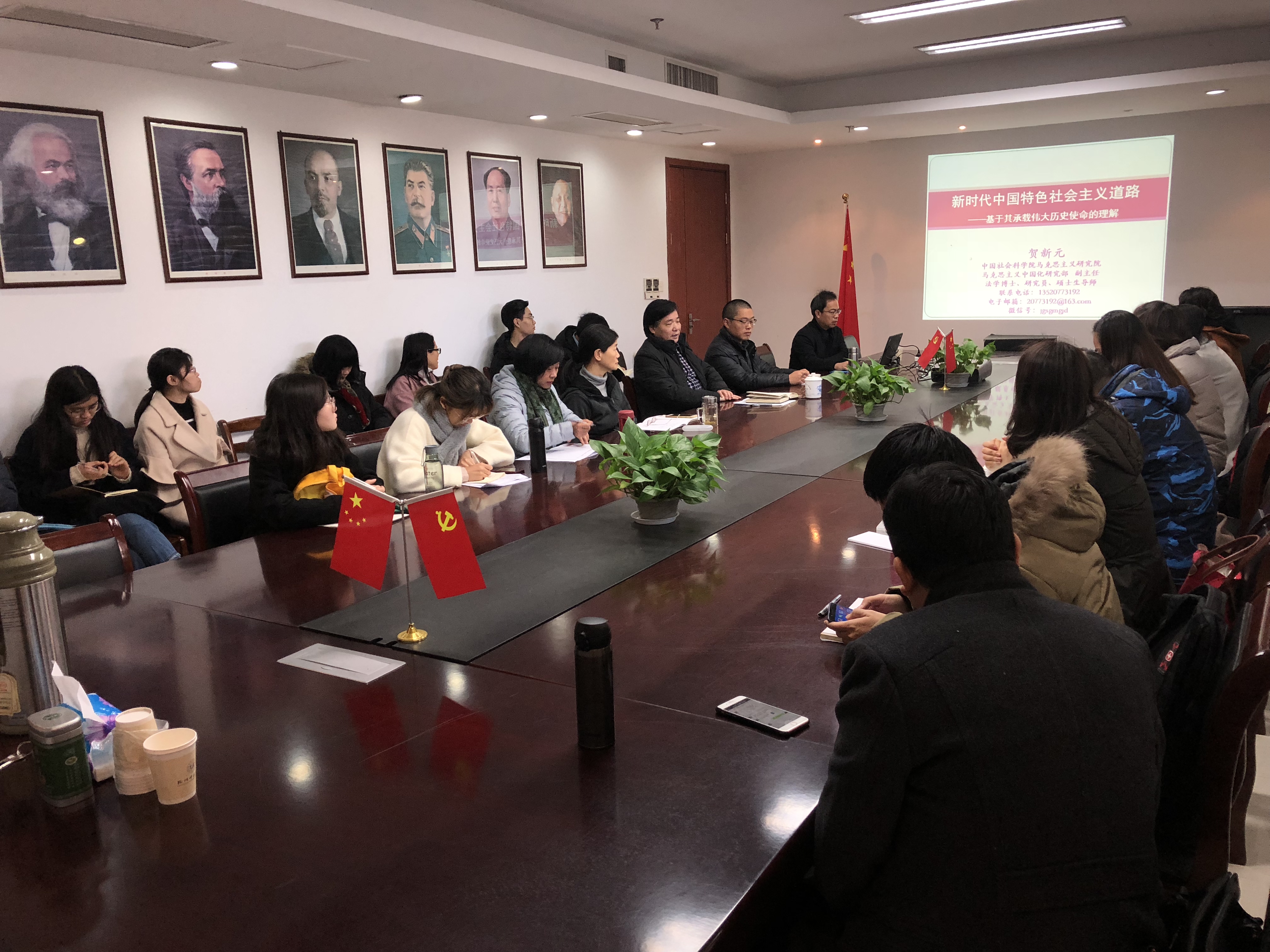 12月18日上午,中国社会科博彩导航 马克思主义研究院马克思主义中国化研究部副主任贺新元教授应邀来博彩导航 作题为“新时代中国特色社会主义道路---基于其承载伟大历史使命的理解”的学术报告。本次报告会由博彩导航-十大博彩网站导航 院长余龙进教授主持,副院长何丽君、博彩导航 部分教师、全体研究生及杭州师范大学学生习近平新时代中国特色社会主义思想研究会成员参加了报告会。
